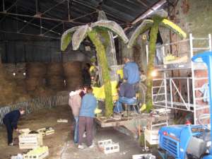 Dès la mi-septembre, chaque quartier se retrouve pour échanger des idées glanées pendant "l’inter saison". Il s’agit d’une réunion préparatoire où tout va prendre sens. Les dessinateurs, les concepteurs, les couturières échangent et se projettent vers ce qui va devenir "char animé". Si c’est ok pour les charistes et les couturières, le thème prend forme et chacun allant de son idée, de son expérience donne son impression sur le sujet. Lorsque l’idée est retenue, chacun dans sa partie va s’investir pour trouver le support de base. Joël, Philippe, Bernard vont travailler les plans avec perspectives, voire "3D". Mi-octobre, la matière première est arrivée dans "le local" bâtiment mis à disposition par son propriétaire agriculteur ou artisan. Il s’agit de 300 à 400 m de fil de fer qu’il faudra former à l’aide de coups de marteau ou cintreuse, découper pour ensuite souder. Plus de 1000 points de soudure seront nécessaires