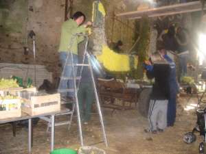 Chaque fleur est "piquée" avec autant de rigueur que de geste artistique. C’est pendant une grande partie de la nuit, et avec minutie, que le "tableau" prend toute sa splendeur. De temps en temps, une petite pause pour prendre le recul nécessaire dans sa tête, mais aussi pour se restaurer afin de tenir physiquement et moralement. Il règne une ambiance très particulière et conviviale en cette finition. Et si, par malheur, un quartier est un peu trop avancé en floraison et qu’il y a risque de pénurie, alors un esprit de solidarité est en place. Chaque quartier possède un listing téléphonique et peut solliciter le quartier voisin ou proposer ses surplus de fleurs. |